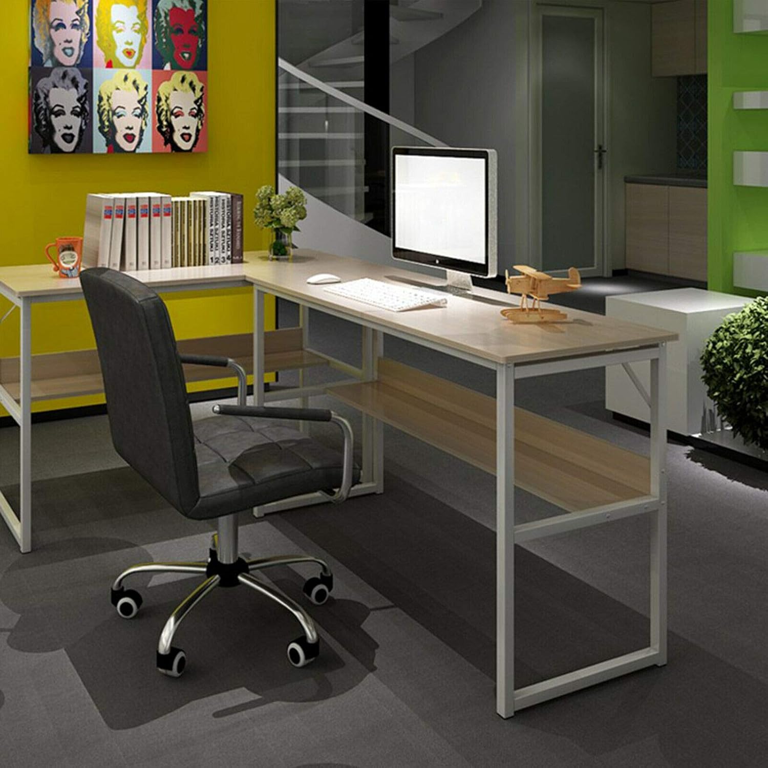 Corner desks are designed to fit in corners of a room, taking up less space.
